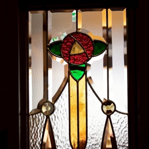 店内の壁には、やさしく光を通すステンドグラスが施されています。